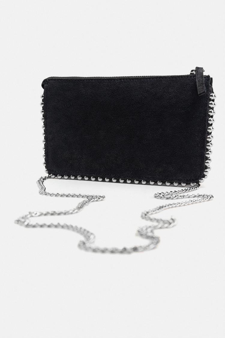Bolso formato bandolera convertible en cartera. Interior con varios compartimentos. Asa de hombro en cadena extraíble. Metalería plateada. Cierre mediante cremallera.